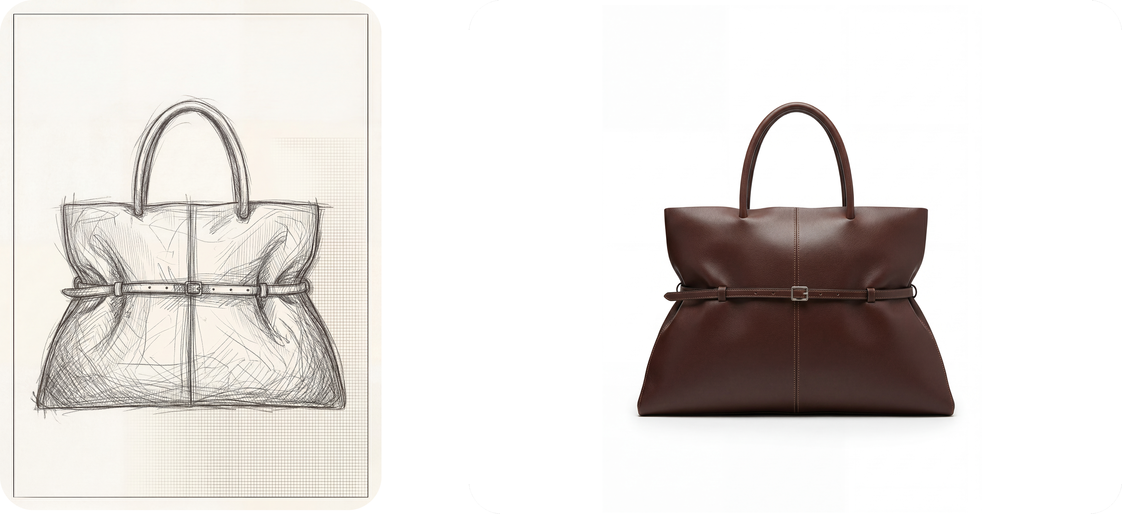 LOOK supports the full creative workflow. You can turn sketches into photorealistic renderings, swap fabrics and prints with precision, generate flat sketches with one click, experiment with concept ideas on garments, and more.